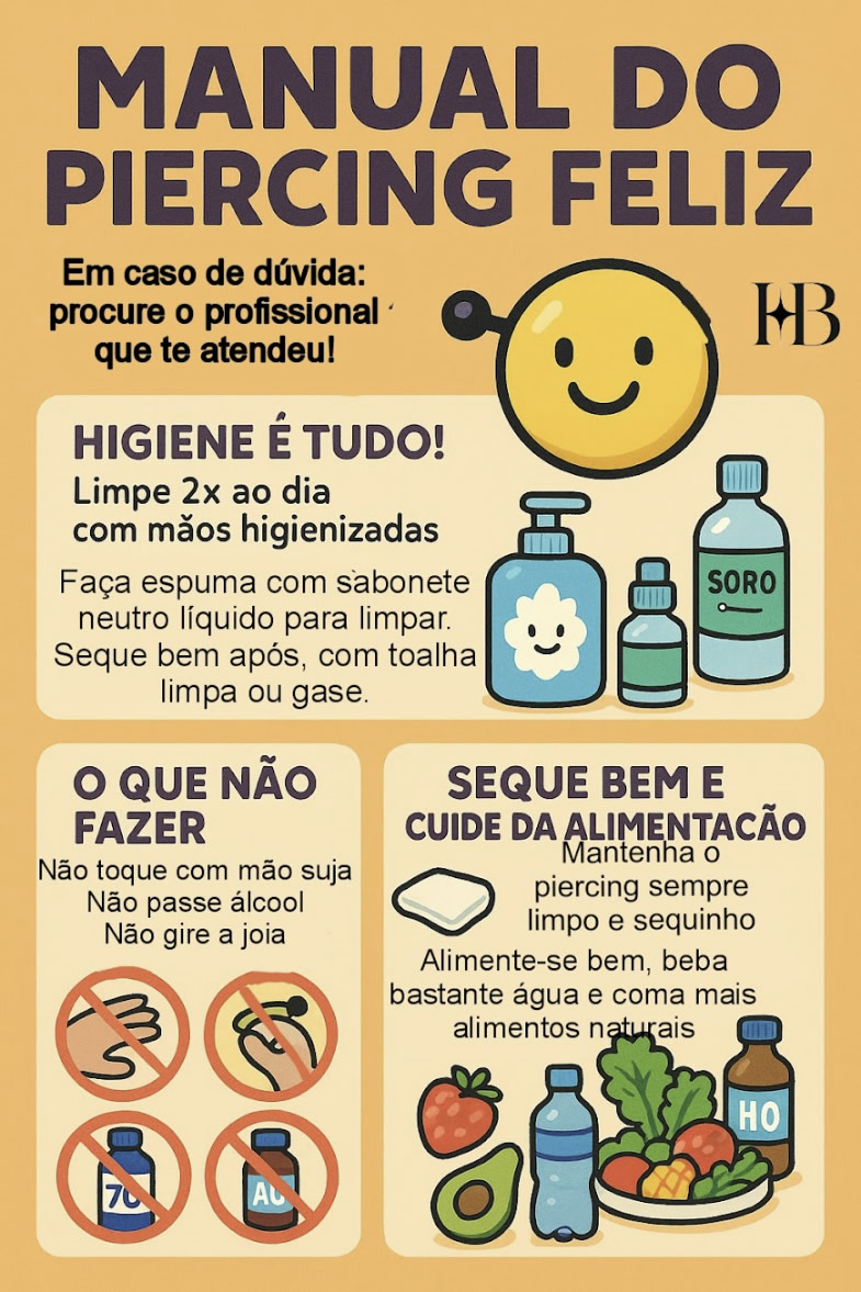 É importante proteger o piercing contra calor excessivo (como secadores e saunas), pancadas, contato oral e evitar banhos de mar, piscinas ou rios durante o período de cicatrização.